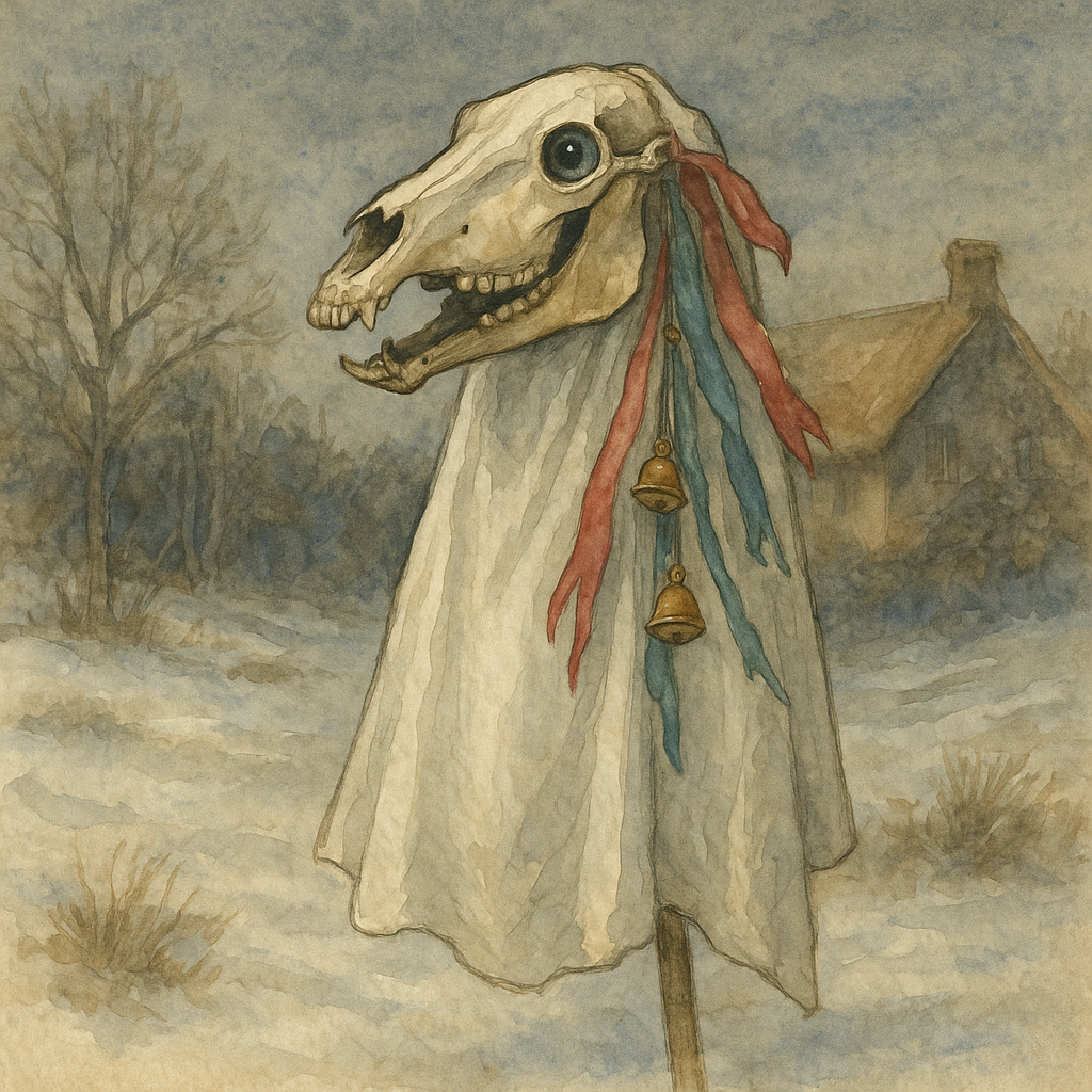 Winter in Wales once carried a knock at the door that blurred the line between festivity and the supernatural. Imagine opening your home on a dark midwinter night to see a horse’s skull—with glassy eyes, snapping jaw, and ribbons fluttering in the wind—standing on your doorstep. Draped in a white sheet and carried by a hidden figure beneath, this was the Mari Lwyd, a ghostly visitor who traveled house to house demanding entry.